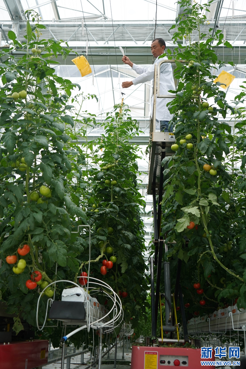 番茄藤最高可长到七米,技术员通过升降机打理番茄藤。