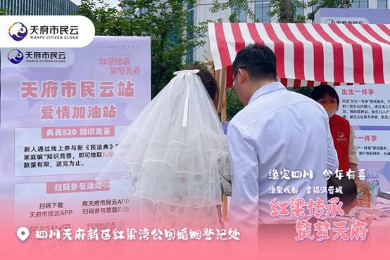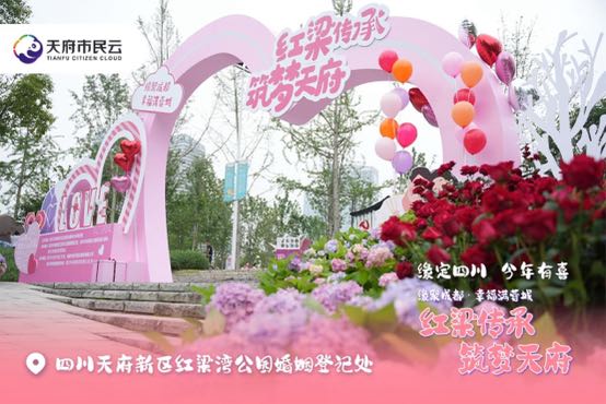 当天,天府市民云联合四川天府新区红梁湾公园婚姻登记处以“红梁传承 · 筑梦天府”为主题,开展了一场丰富多彩的婚俗文化主题活动。