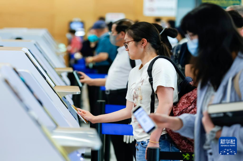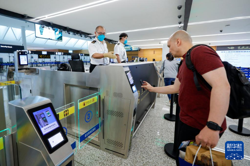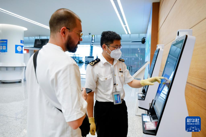 6月21日,在成都天府国际机场,成都海关关员(右)指导一名外国旅客使用自助申报机进行出境健康申报。新华社记者 沈伯韩 摄
