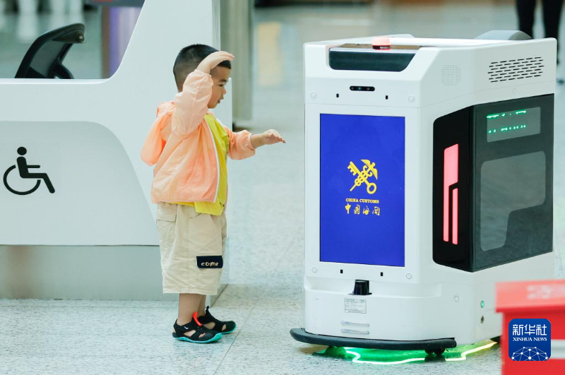 6月21日,在成都天府国际机场,一名小旅客被手提行李智能携运机器人所吸引。该机器人可以辅助海关关员封存、运输异常行李,并引领异常行李旅客到达海关开包间。新华社记者 沈伯韩 摄