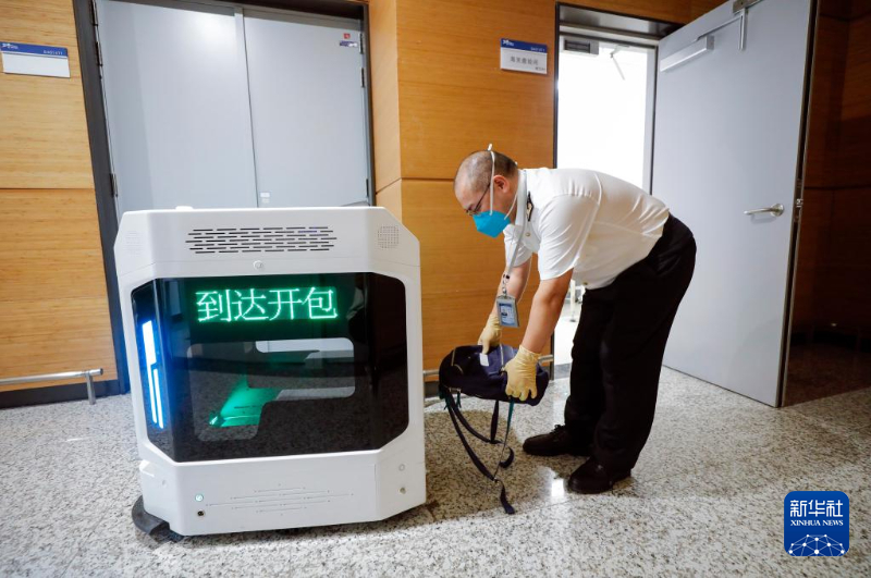 6月21日,在成都天府国际机场,成都海关关员从手提行李智能携运机器人中取出异常行李,准备开包检查。新华社记者 沈伯韩 摄