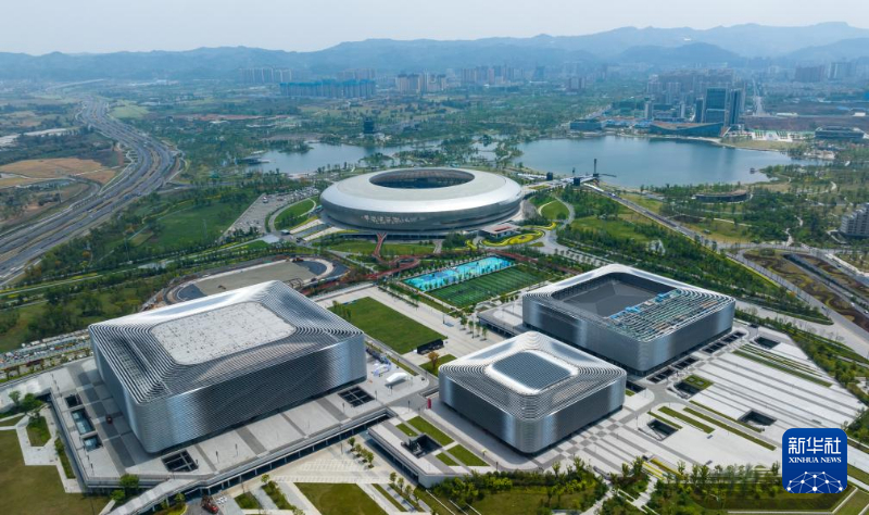 这是2023年4月18日拍摄的东安湖体育公园主体育场(后)、多功能体育馆(前左)、游泳跳水馆(前右)和小球馆(前中)。新华社记者 沈伯韩 摄