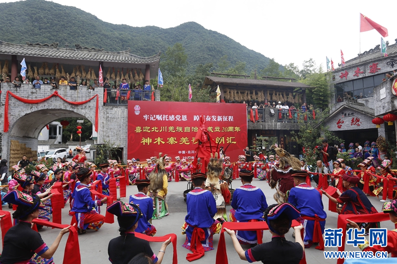 8月24日,在四川省绵阳市北川羌族自治县通泉镇神木寨村,200多名羌族群众身着节日的盛装,唱起羌歌、跳起沙朗,举行羌歌沙朗汇,正式拉开北川羌族自治县成立二十周年庆祝活动的序幕。