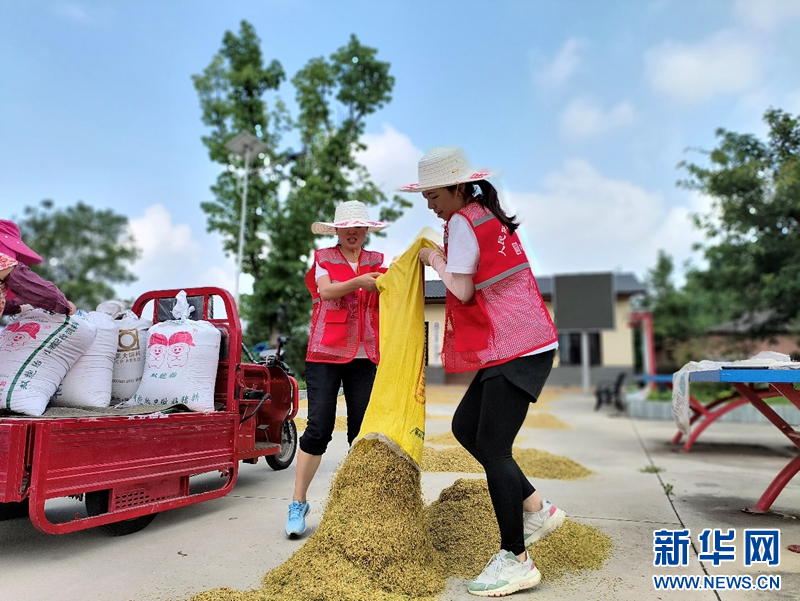 人保财险双流支公司党支部党员在农户院子中晾晒收割的水稻。