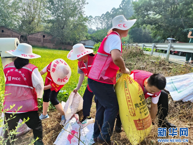 8月23日,在成都市双流区永安镇的稻田里,人保财险双流支公司党员帮助农户抢收稻谷,确保颗粒归仓。