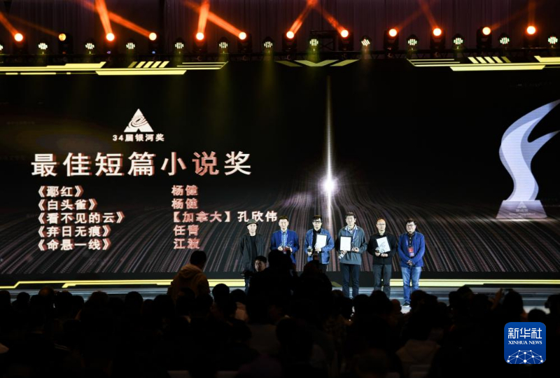 10月19日,在第34届中国科幻银河奖颁奖典礼上,嘉宾为获得最佳短篇小说奖的代表颁奖。新华社记者 王曦 摄