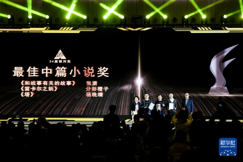 10月19日,在第34届中国科幻银河奖颁奖典礼上,嘉宾为获得最佳中篇小说奖的代表颁奖。新华社记者 王曦 摄