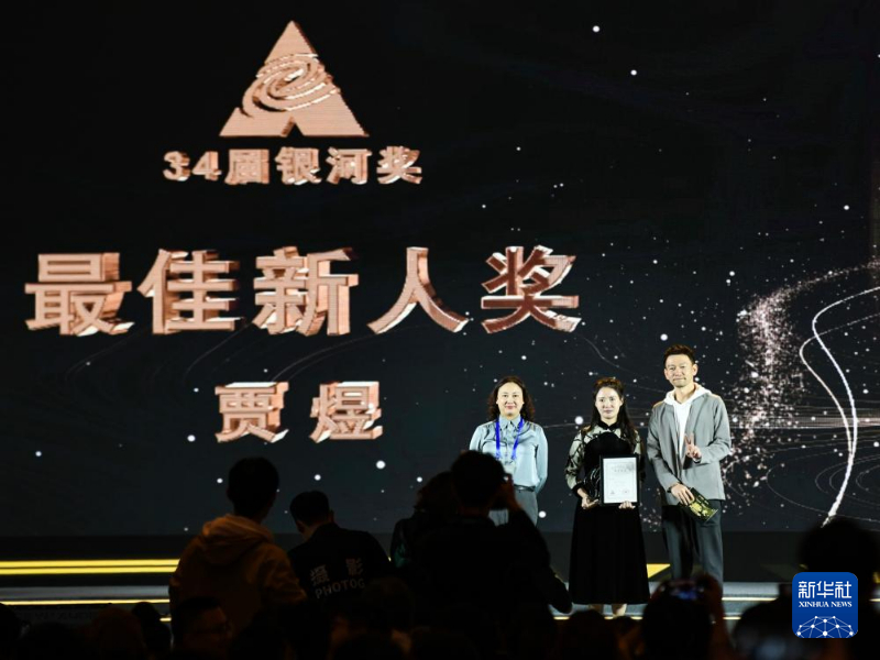 10月19日,在第34届中国科幻银河奖颁奖典礼上,嘉宾为获得最佳新人奖的代表颁奖。新华社记者 王曦 摄