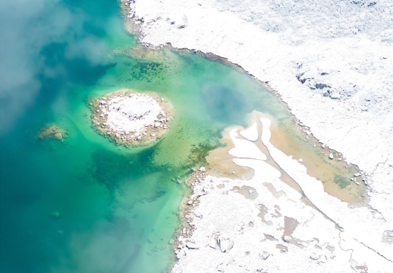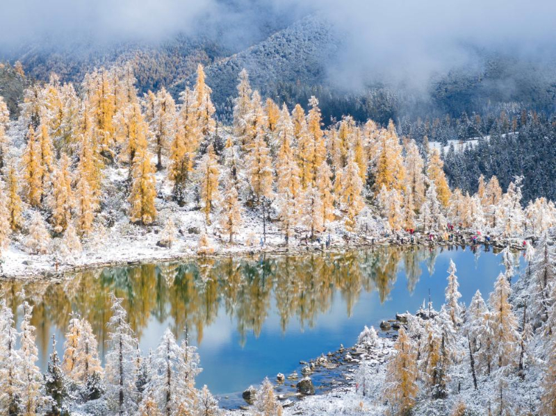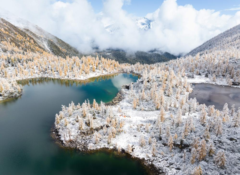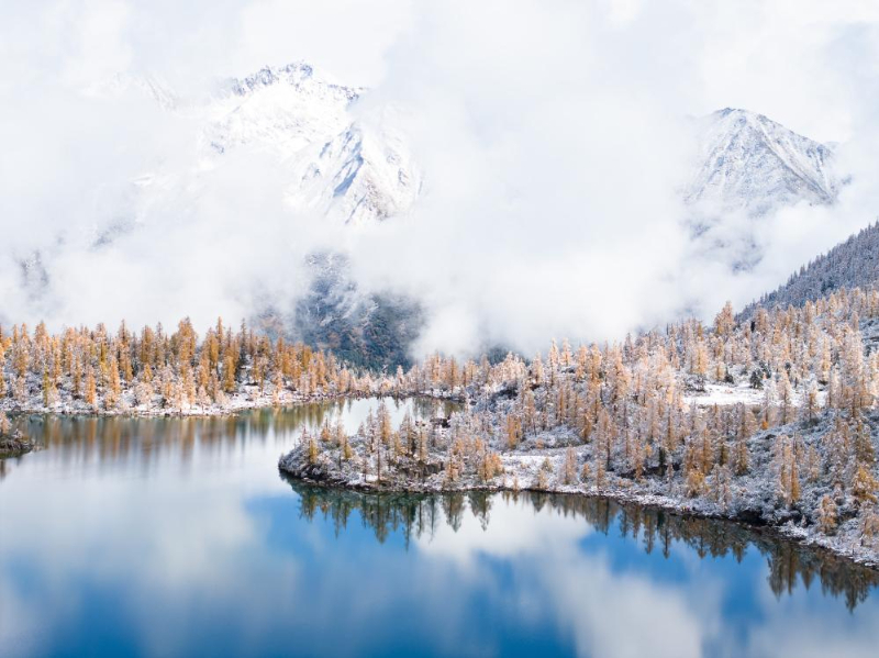 雪山、党岭村葫芦海、彩林构成一幅优美的画卷(10月27日摄,无人机照片)。新华社记者 江宏景 摄