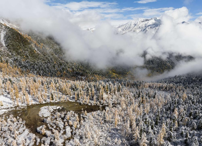 雪山和党岭村葫芦海、彩林构成一幅优美的画卷(10月27日摄,无人机照片)。新华社记者 江宏景 摄