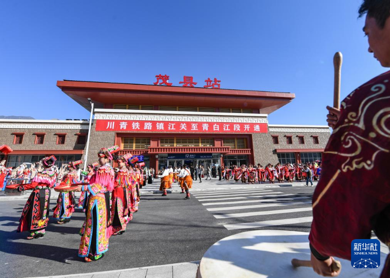 11月28日,在川青铁路茂县站,当地各族群众在站前广场庆祝铁路开通运营。新华社记者 王曦 摄