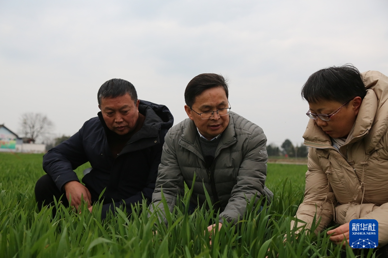 2月4日,国家小麦产业技术体系岗位科学家汤永禄(中)在麦田中查看小麦长势。新华社记者杨进 摄