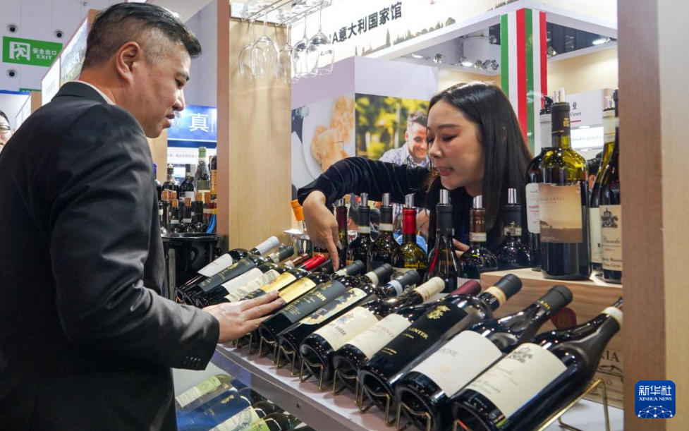 3月20日,在第110届全国糖酒商品交易会中国西部国际博览城展馆内,参展商向客户介绍进口红酒。新华社记者 唐文豪 摄