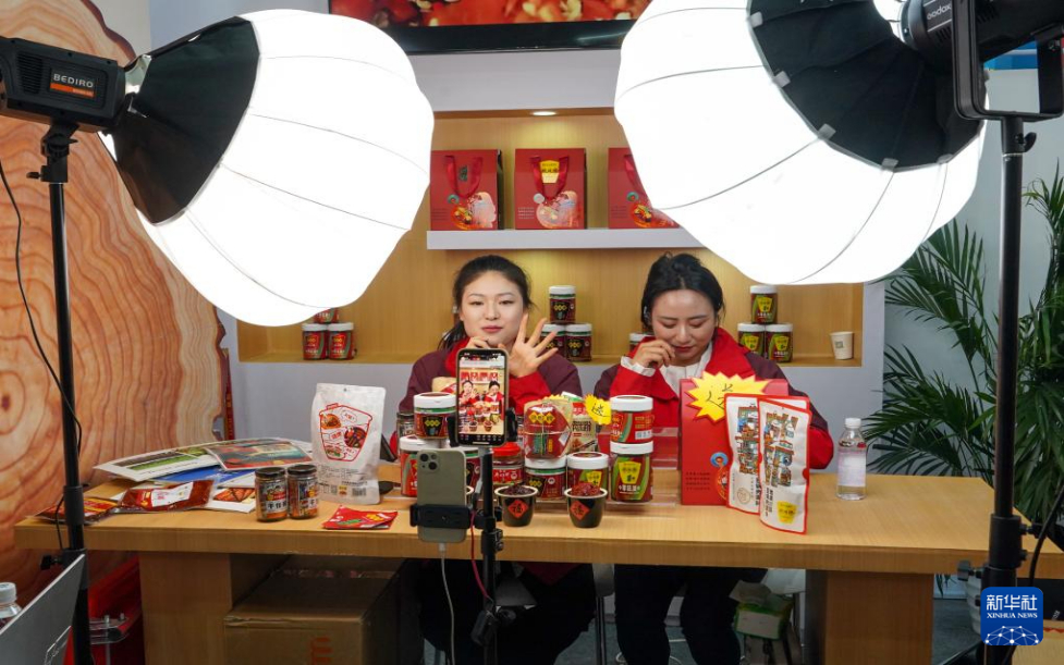 3月20日,在第110届全国糖酒商品交易会中国西部国际博览城展馆内,参展商在进行直播。新华社记者 唐文豪 摄