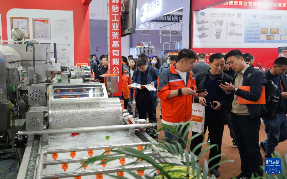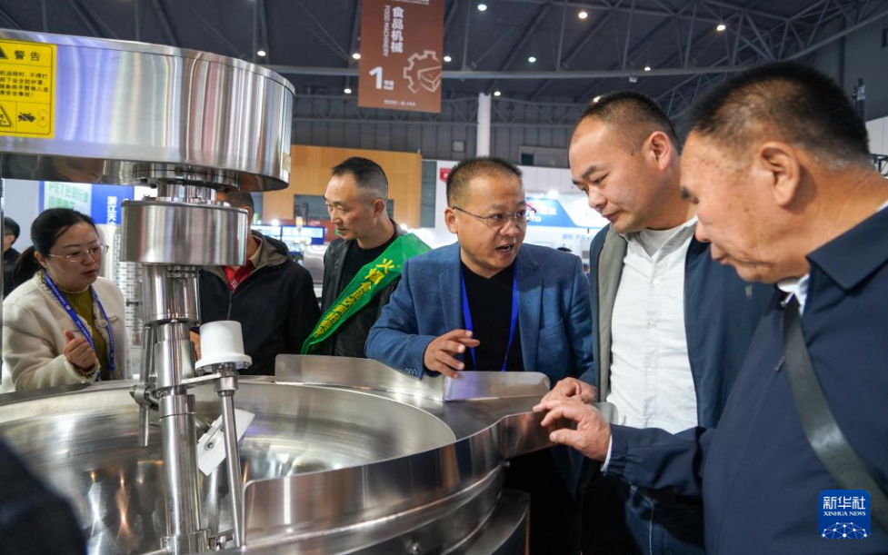 3月20日,在第110届全国糖酒商品交易会中国西部国际博览城展馆内,参展商向客户介绍智能化食品生产线。新华社记者 唐文豪 摄