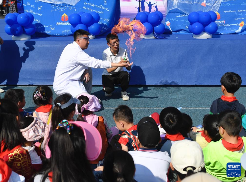 3月29日,成都市泡桐树小学(天府校区)学生在科技节上观看趣味科学实验。新华社记者 刘坤 摄
