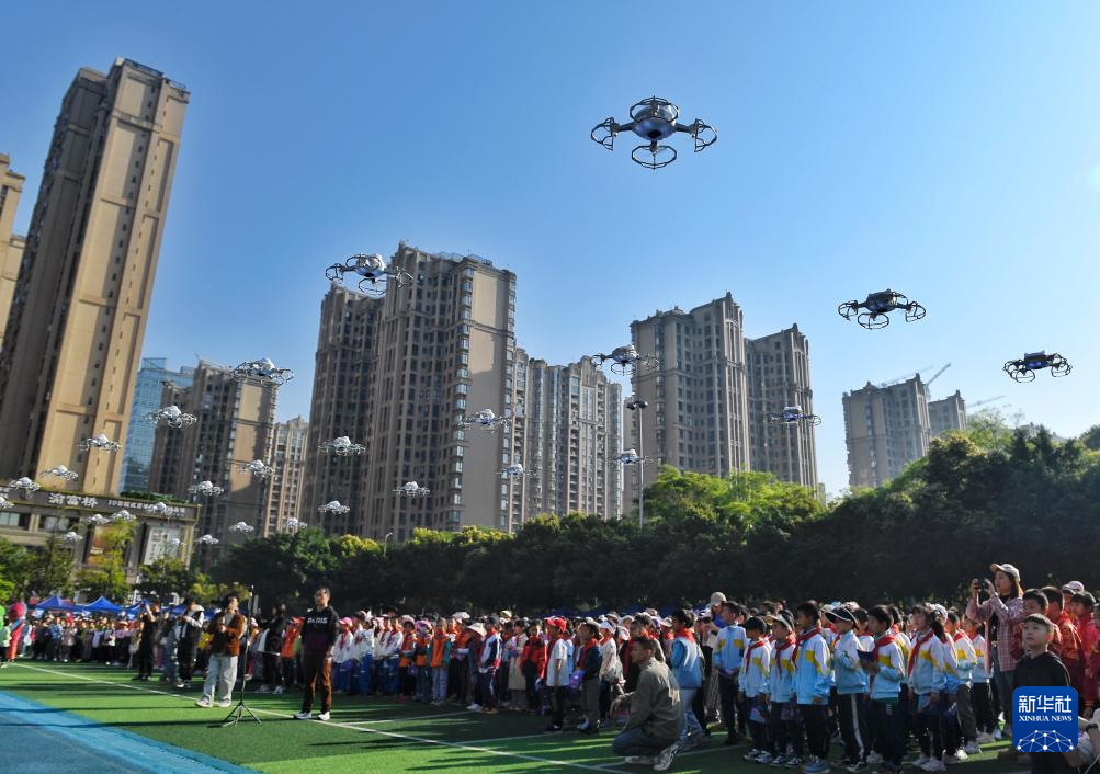 3月29日,成都市泡桐树小学(天府校区)学生在科技节上观看无人机表演。新华社记者 刘坤 摄
