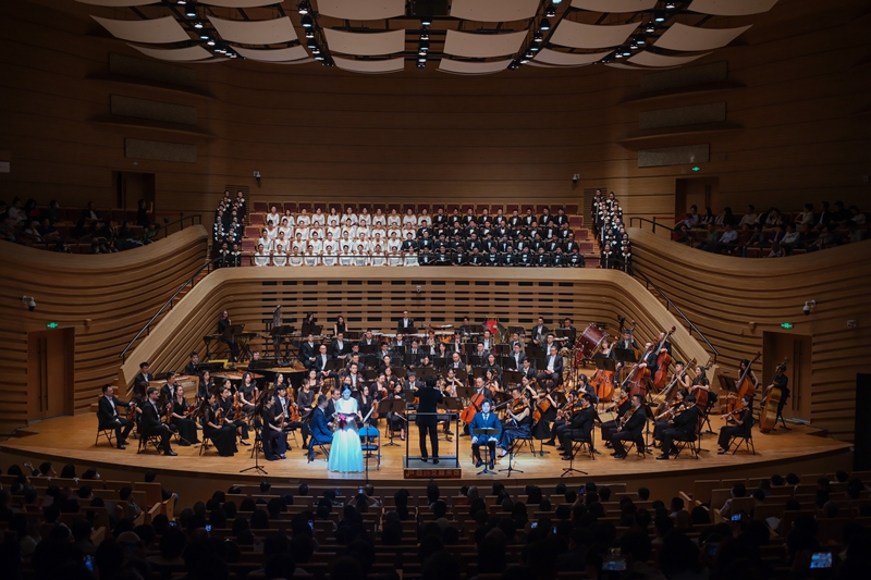 四川交响音乐厅首场音乐会现场,四川交响乐团与吕思清共同奏响《梁祝》。德国作曲家卡尔·奥尔夫创作的《布兰诗歌》,兼具戏剧性和抒情力,音乐会现场,以一个大型管弦乐团、80人的混声合唱团、40人的童声合唱队、3位歌唱家的编制,表现对命运的召唤、对世俗的拷问、对人生的思索。