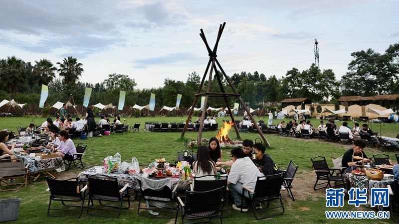6月16日,游客在新都区夏河溪野咖轻奢露营地边吃烧烤边听音乐。新华网发(张可凡 摄)