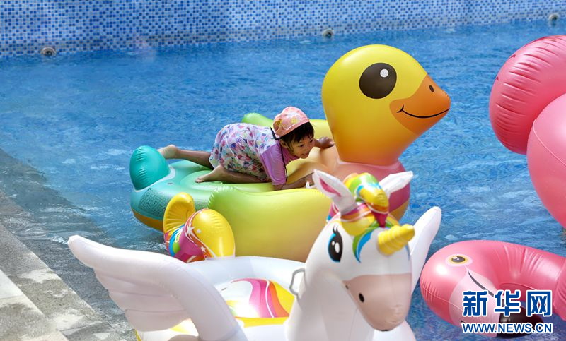 6月16日,小朋友在新都月隐花酒店泳池玩耍。新华网发(张可凡 摄)