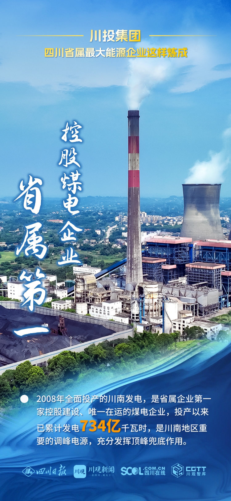 2008年全面投产的四川泸州川南发电有限责任公司,是省属企业第一家控股建设、唯一在运的煤电企业,投产以来已累计发电734亿千瓦时,是川南地区重要的调峰电源,充分发挥顶峰兜底作用。