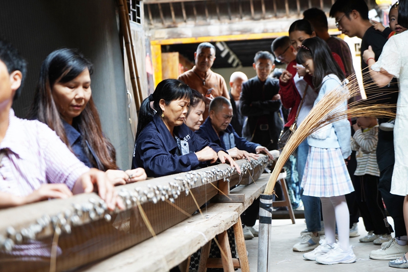 游客观看夹江手工造纸技法中的竹纸制作技艺。(黎涛 摄)
