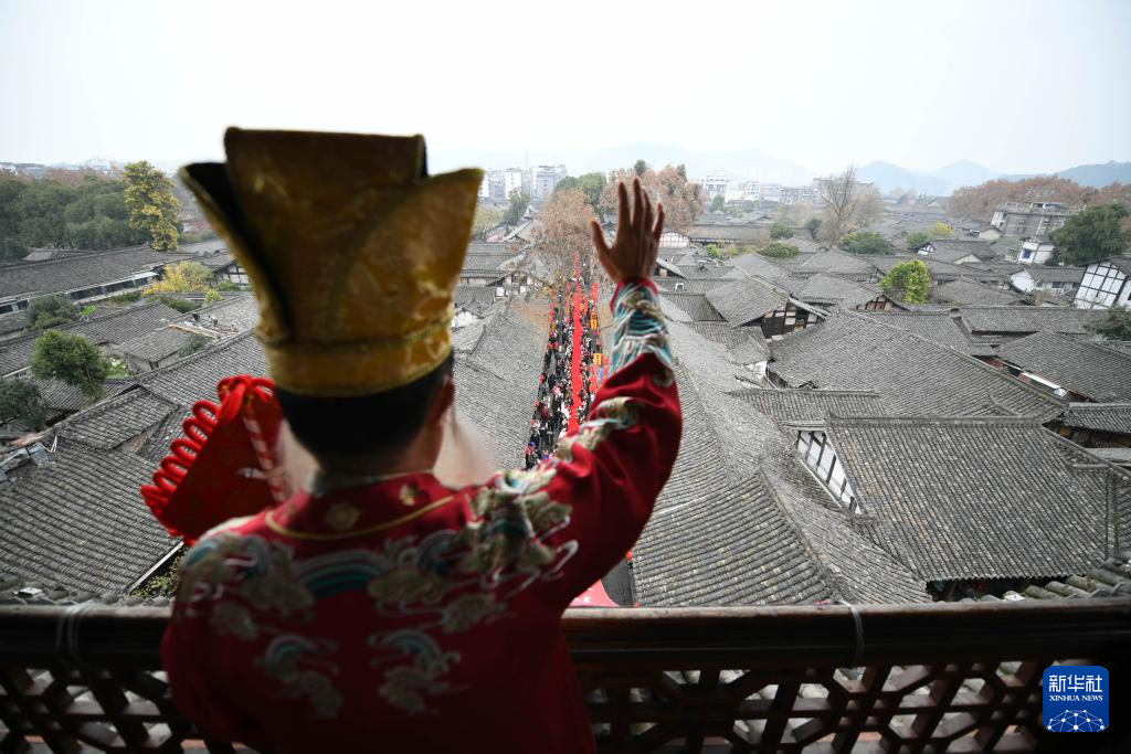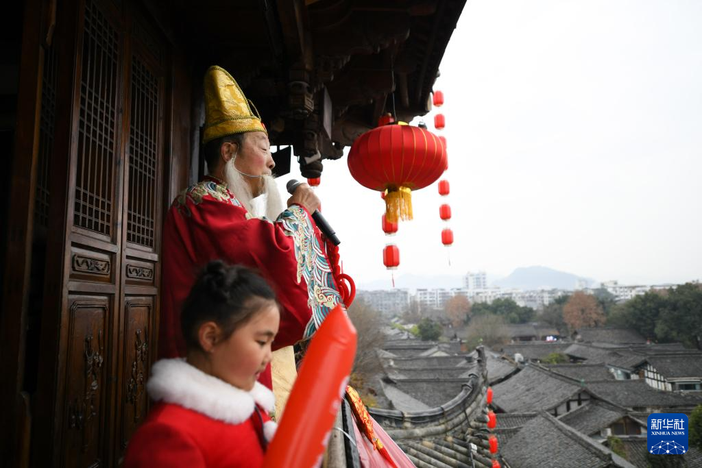 1月7日,阆中古城启动春节文化系列活动,张忠和在阆中古城中天楼上向市民游客送祝福。新华社记者 胥冰洁 摄