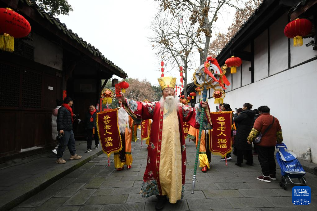 1月7日,阆中古城启动春节文化系列活动,张忠和手持红包跟随音乐舞动,为游客送上祝福。新华社记者 胥冰洁 摄