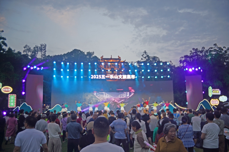“五一”假期乐山文旅集市上的文艺演出吸引市民和游客。(黎涛 摄)