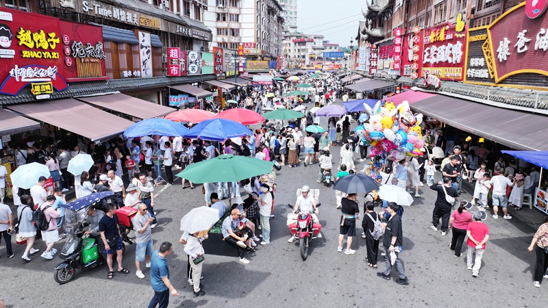 “五一”假期乐山美食街区游人如织。(浦留洋 摄)