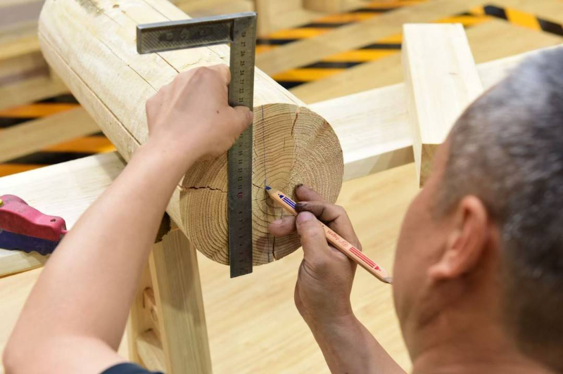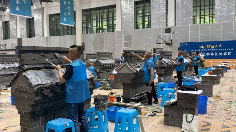 叮当作响的敲击声,咔嚓咔嚓的锯木声,木头断裂时发出的脆响……相较于纸张书画文物修复、陶瓷文物修复赛区的安静平和,木作文物修复赛区可谓一派“热火朝天”的景象。而与其相邻的泥瓦作文物修复赛区,也不断传来搅动和刮水泥的声响,细看赛区中,有头发微微花白、手艺娴熟的“老师傅”们,也有认真专注的青年人。在这数百平方米的场地上,文物技能人才正进行着“比拼”。
