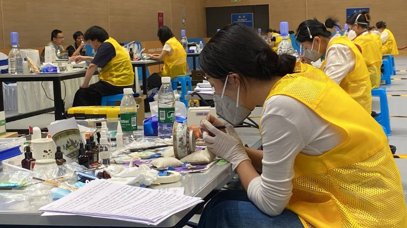 一张张工作台在宽阔的室内场地中依次排开,上面摆放着喷壶、电吹风、刷子、毛笔等各类的工具,台上之人正聚精会神地将全部注意力放在手下的纸张上,容纳着数十人的会场宁静如水,只听见喷水壶发出的细微声响……就在不久后,这里将有一张张被修复好的书画亮相,展示着“文物医生”的技能水平。