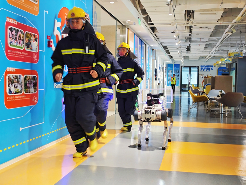 “八楼出现火情!”11时,随着火警在大楼内响起,演练正式开始,消防救援机器狗和特殊警务机器狗齐齐出动奔赴至起火点。“消防机器狗可以现场灭火,警务机器狗则可以快速感知环境,同时也可快速捕捉人流异常与突发警情,将现场画面实时传输回指挥中心,有效提升响应速度。”现场工作人员介绍道。