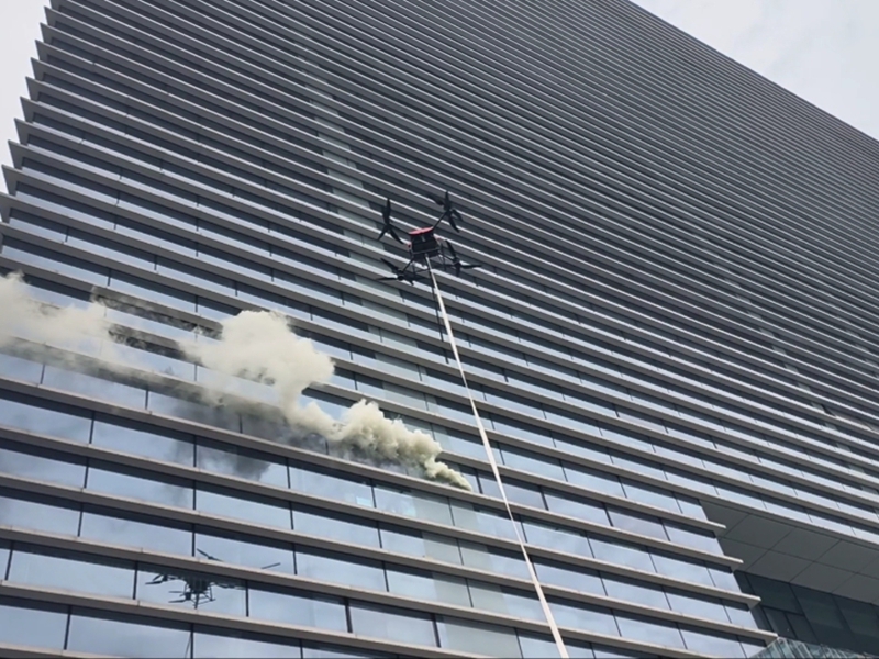 同时,大楼外,一架高空灭火无人机已经升空至八楼起火点楼体之外,精准悬停至距离地面几十米处高空的着火区域。无人机搭载的高压水枪喷射出“水龙”直击“燃烧”核心区域,并在十余分钟后顺利完成灭火应急救援任务。最终,整场演习仅用9分30秒完成了约860人的安全疏散。