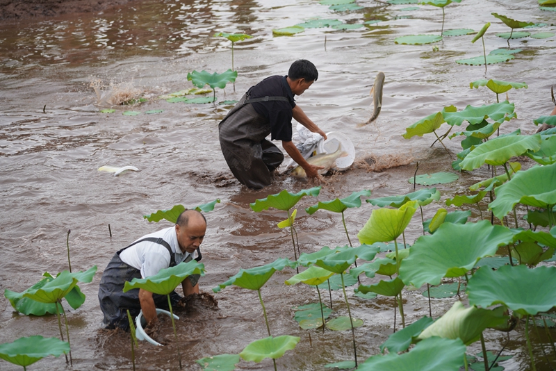 荷花文化旅游季的荷塘捕鱼活动吸引村民和游客前来体验。(黎涛 摄)