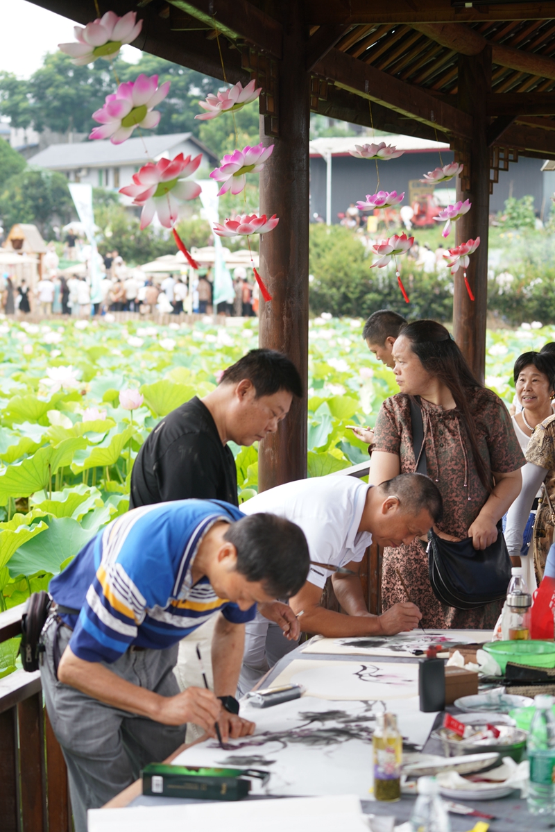 荷塘边画家挥毫泼墨画荷花。(黎涛 摄)