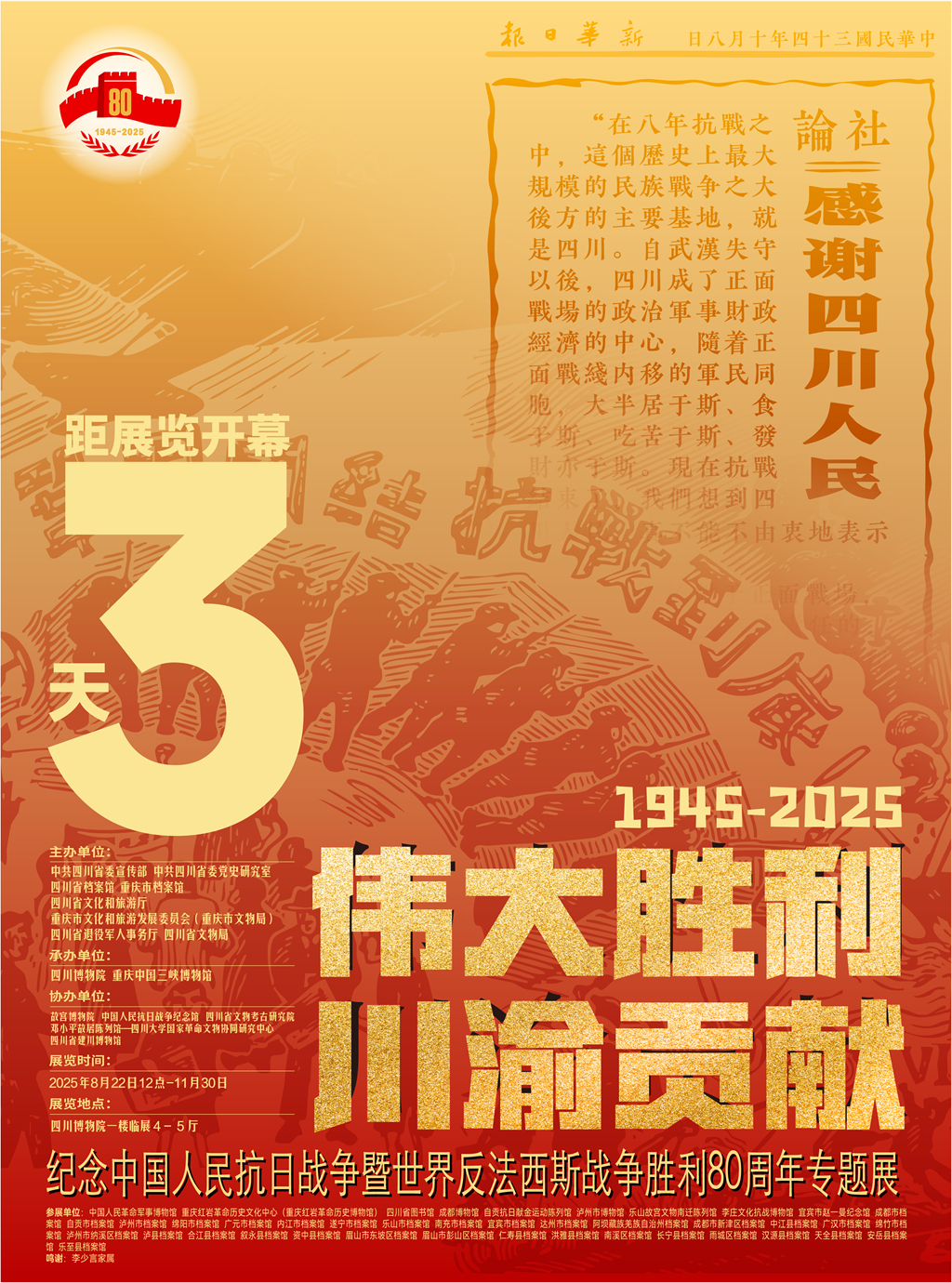 四川博物院联合多家文博单位和档案馆推出的“伟大胜利 川渝贡献——纪念中国人民抗日战争暨世界反法西斯战争胜利80周年”专题展将于8月22日启幕。