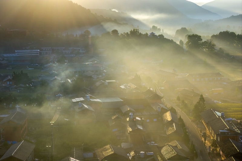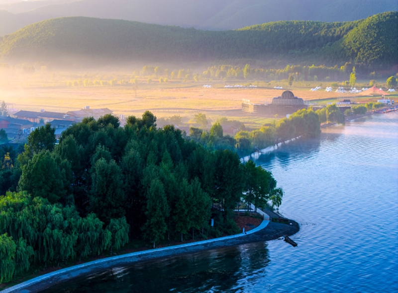 晨雾中的泸沽湖畔摩梭人村落(9月15日摄,无人机照片)。
