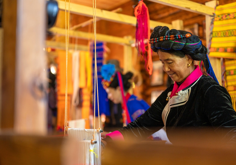 9月15日,泸沽湖景区摩梭非遗工坊里,几位妇女在展示纺织传统技艺。