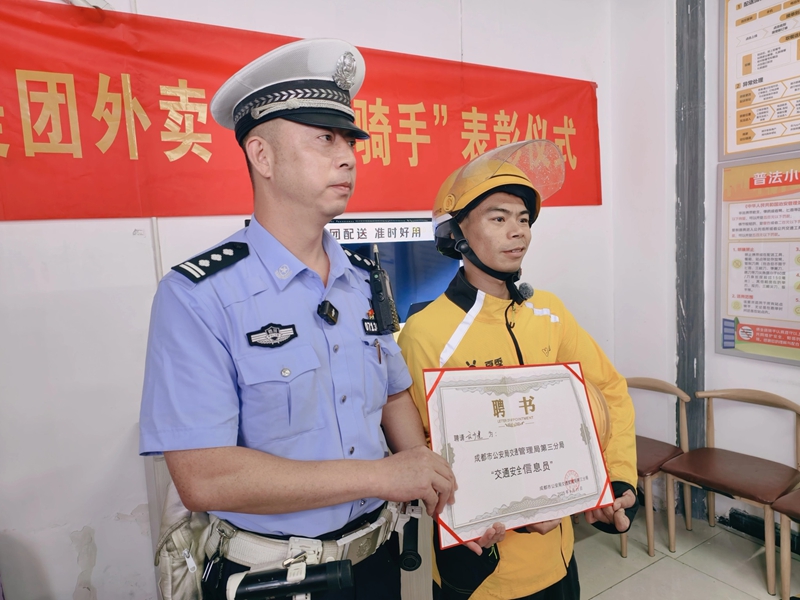 近日,一名叫文少建的成都外卖小哥在网络上火了,事情的起因是他在深夜救助了一名年近九旬的老人。9月11日,在锦江区锦华路街道凯天社区工会驿站,成都交警三分局正式聘请文少建担任“交通安全义务信息员”,民警特别为他送上一个安全头盔。“骑手文少建的行为,避免了极端交通安全事故的发生,在危急时刻拯救了他人的生命,值得鼓励和表彰。”成都交警三分局的民警说。