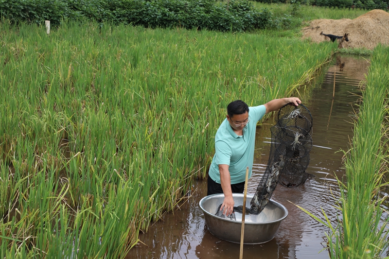 这种“一田两用、虾稻双收”的生态循环农业模式,正在牟坪镇稳步发展,成为当地农户增收的有效途径。在八一村新牟家庭农场——翠屏区首家实行“稻蟹共生”模式的家庭农场里,负责人石勇也迎来了丰收季。他介绍说,稻蟹、稻虾立体种养不仅实现了资源高效利用,产出的水产品也因为生态绿色,深受消费者欢迎。“现在我们的‘稻田蟹’‘稻田虾’市场销路很不错,看今年罗氏沼虾的好长势,应该也能卖个好价钱。”