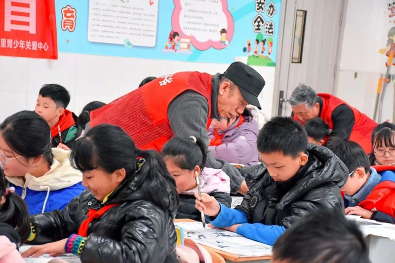 2024年12月,“故事爷爷”宁朵成走进磨子桥小学分校上书法课。