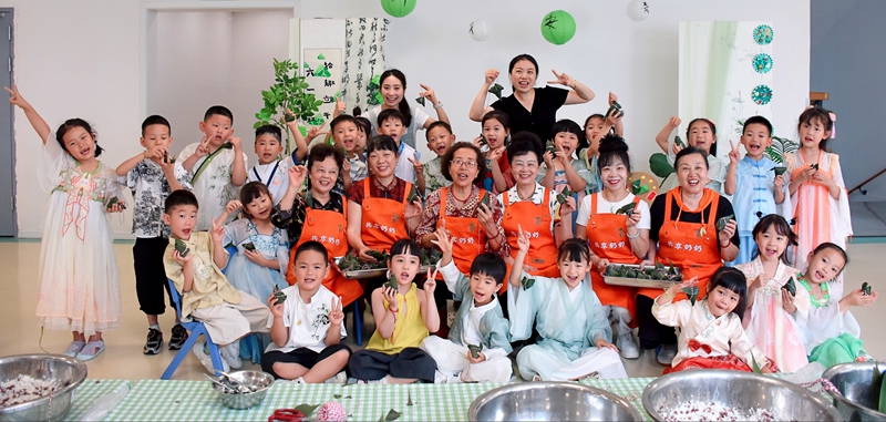 2025年5月29日,“共享奶奶”在成都市武侯区第四十幼儿园开展端午节包粽子活动。