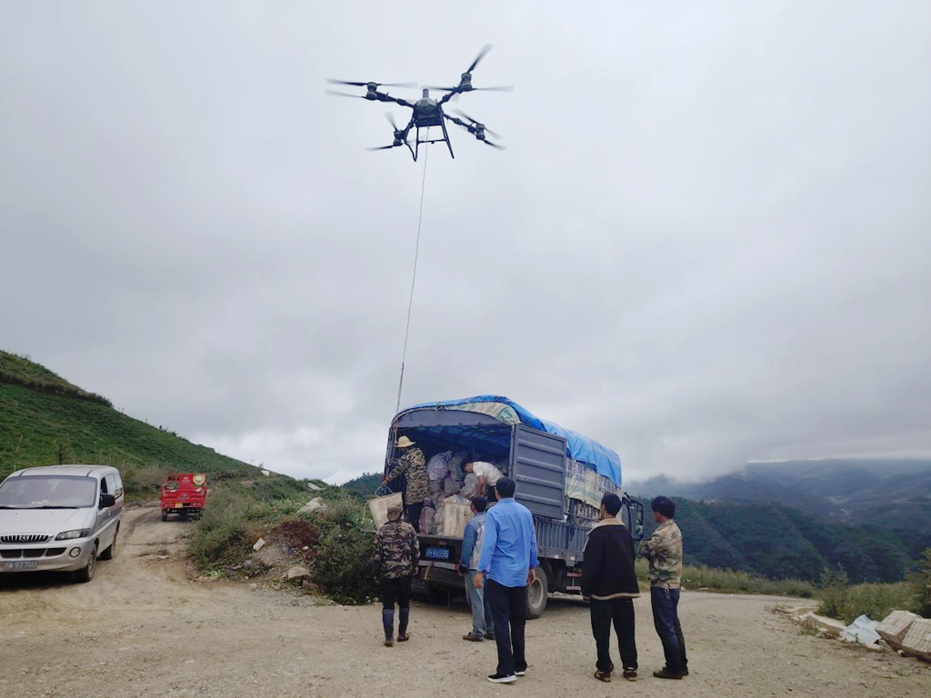 无人机正在将萝卜运送至运输车。(甘洛县融媒体中心 供图)