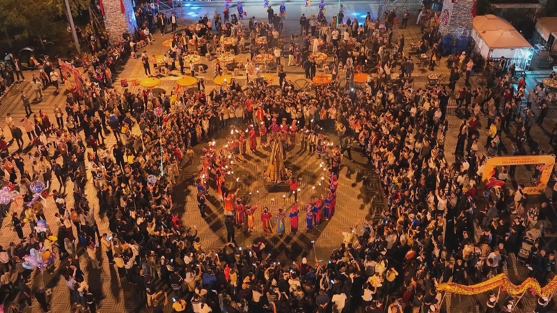 广场上篝火燃起,火龙舞动,吸引大批游客驻足参与。(北川县委宣传部 供图)