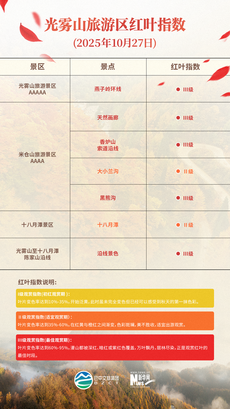 “亚洲最长天然红地毯”进入高光时刻。据四川省巴中市光雾山旅游区提供的数据显示,10月27日,光雾山旅游区内的七大景点,红叶指数均达Ⅱ级以上,其中五个景点红叶指数达到Ⅲ级,进入最佳观赏时段。漫山层林尽染,色彩斑斓,邀您共赴一场秋日的视觉盛宴。(海报:包雨刚)
