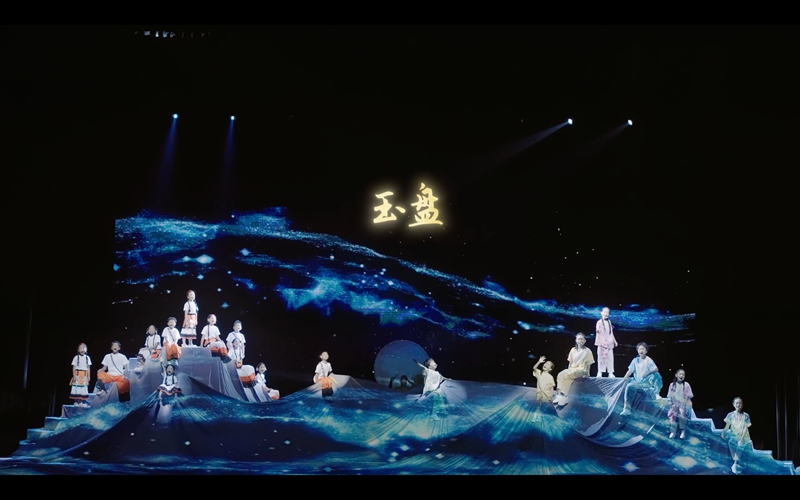 本次《玉盘》的舞台创作以“本真自然”为核心,运用舞美与多媒体视效,营造出从山河湖海到月球星河的沉浸式空间,从儿童视角开启一场与月亮的真挚对话。通过投影技术和“托举”等艺术手法,演出成为了传递求索精神的艺术实践。