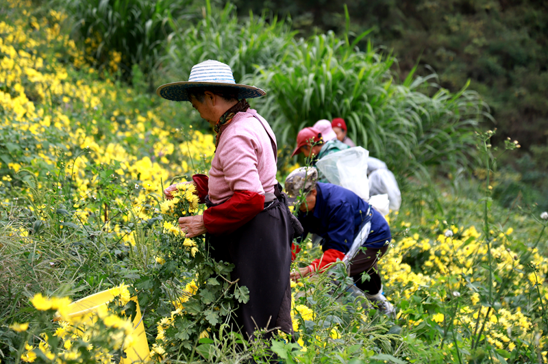 工人正在采摘菊花。(金口河区委宣传部 供图)