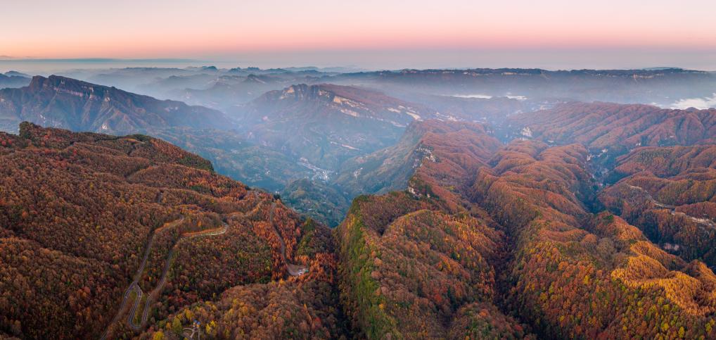 近日,位于四川省广元市旺苍县盐河镇的盐井河大峡谷,3千余公顷林海漫山红遍、层林尽染。顺着蜿蜒的山路盘旋而上,一幅大自然织就的壮美画卷扑面而来,形成秋季“车行十里画屏”的视觉效果。新华社发(刘华伟 摄)
