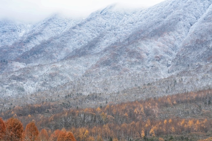 米仓山景区大坝景点的初雪和彩林。新华社发(付海旭 摄)